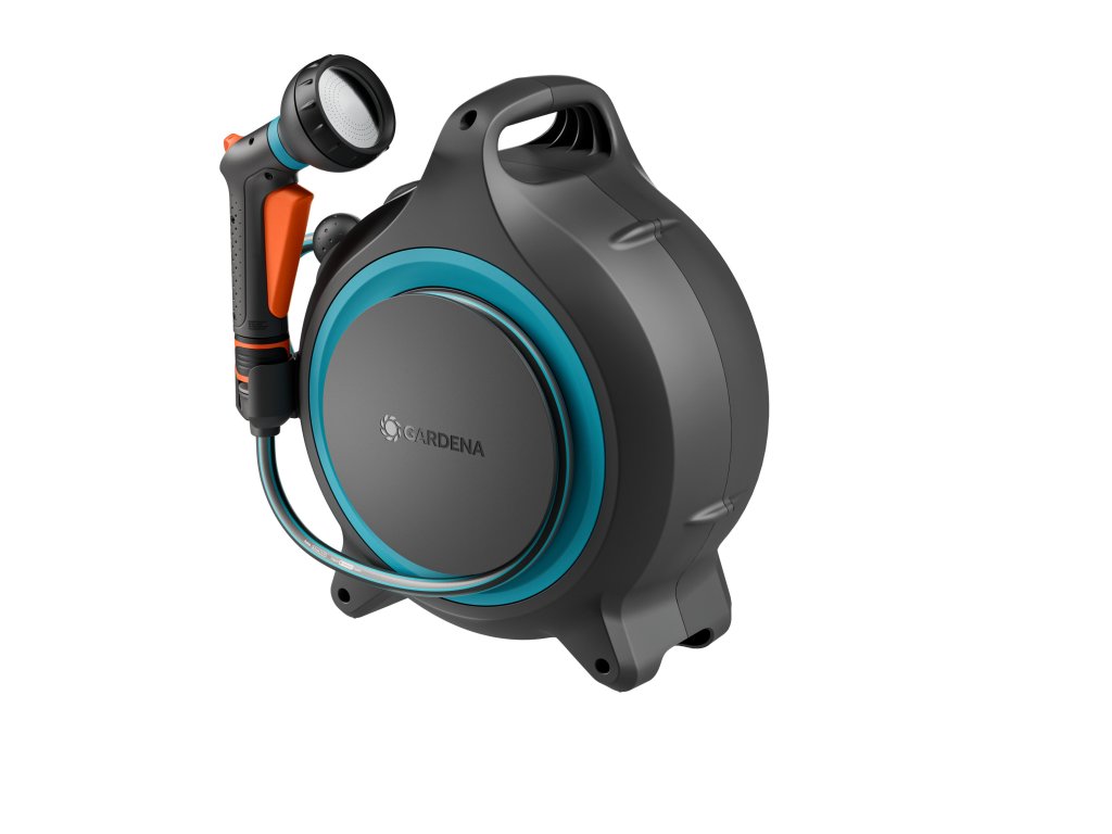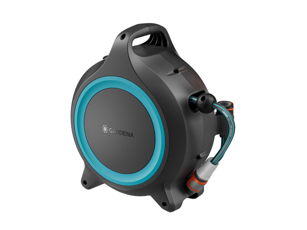 Přenosný box na hadici MoveMatic od společnosti GARDENA je malý, kompaktní a praktický. Díky automatickému navíjení hadice, 12,5 m hadici a 1,5 m připojovací hadici je vhodný pro balkony, terasy a na cesty.