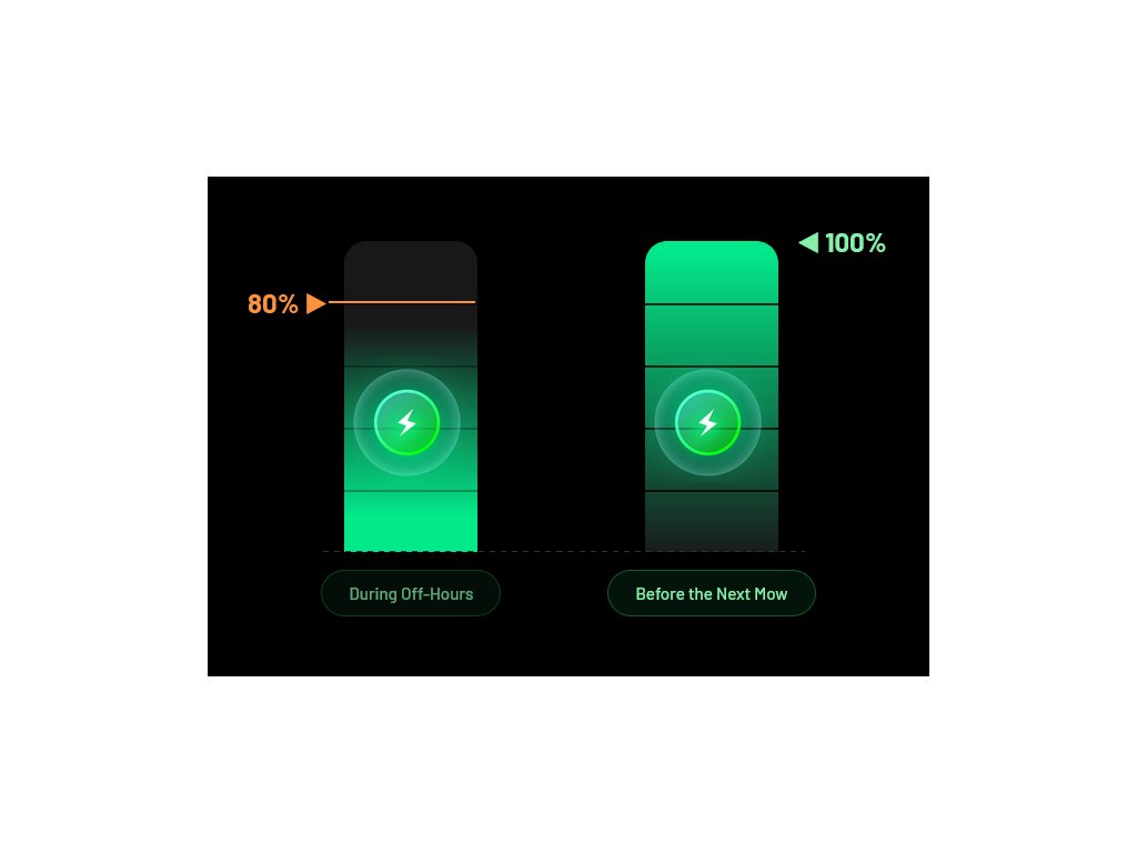 Jakmile kapacita baterie klesne pod 15 %, sekačka se automaticky vrátí do nabíjecí stanice. Po dobití pokračuje v sekání přesně tam, kde přestala.