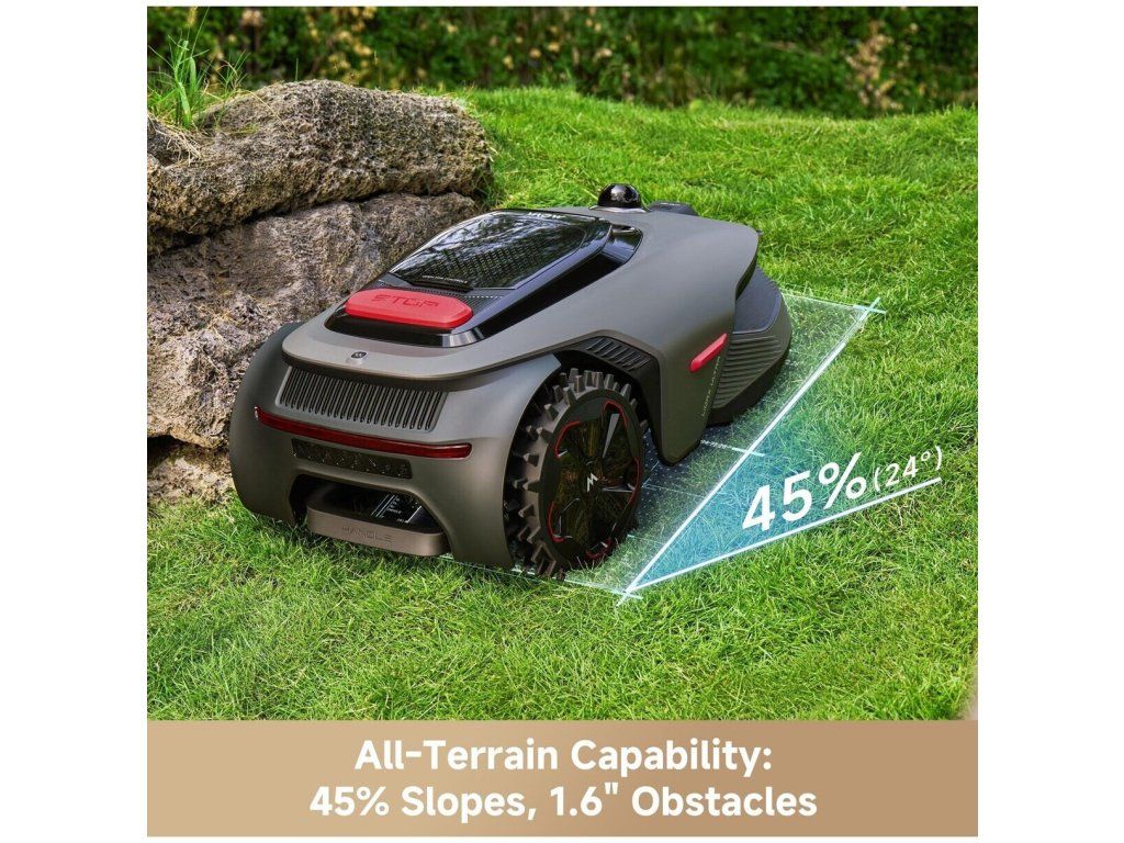 Díky velkým zadním terénním kolům si sekačka snadno poradí i s členitým nebo vlhkým terénem a zvládne svahy se sklonem až 45 %. Terénní kola navíc minimalizují riziko smyku, což zvyšuje efektivitu sekání a zároveň chrání trávník před poškozením. Inteligentní robot je navíc vybaven plovoucím žacím ústrojím, které se flexibilně přizpůsobuje nerovnostem terénu, což zvyšuje efektivitu sekání a snižuje riziko poškození stroje. Kola sekačky dokážou překonat obrubníky a další terénní překážky s výškou až 4 cm.