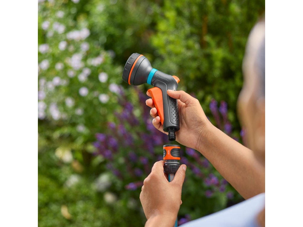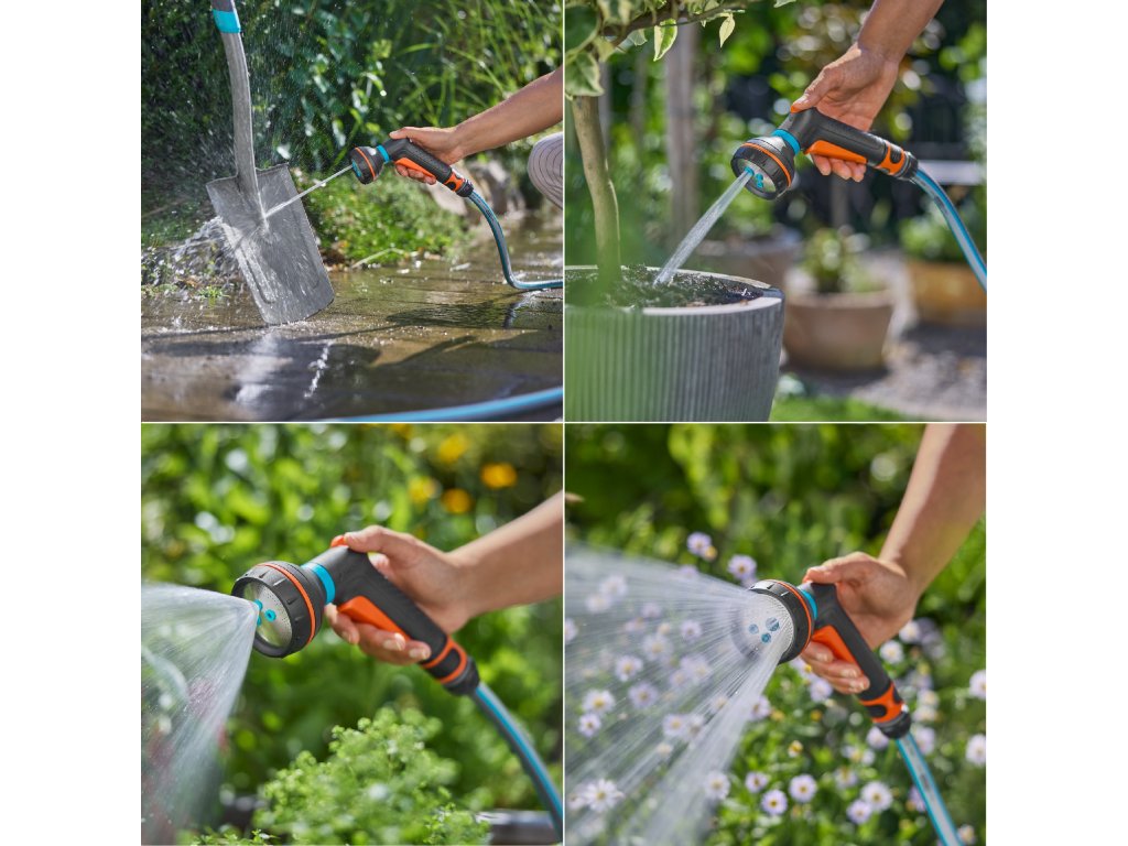 Multifunkční sprcha Classic nabízí výběr ze čtyř režimů postřiku. Kuželový proud je určen pro zavlažování choulostivých rostlin, silný proud pro čištění. Objemový proud je vhodný pro zavlažování rostlin v květináčích a jemný postřik je vhodný pro důkladné zavlažování květinových a zeleninových záhonů. Mezi režimy můžete snadno přepínat, což vám pomůže rychle a efektivně dokončit zavlažování nebo čištění.